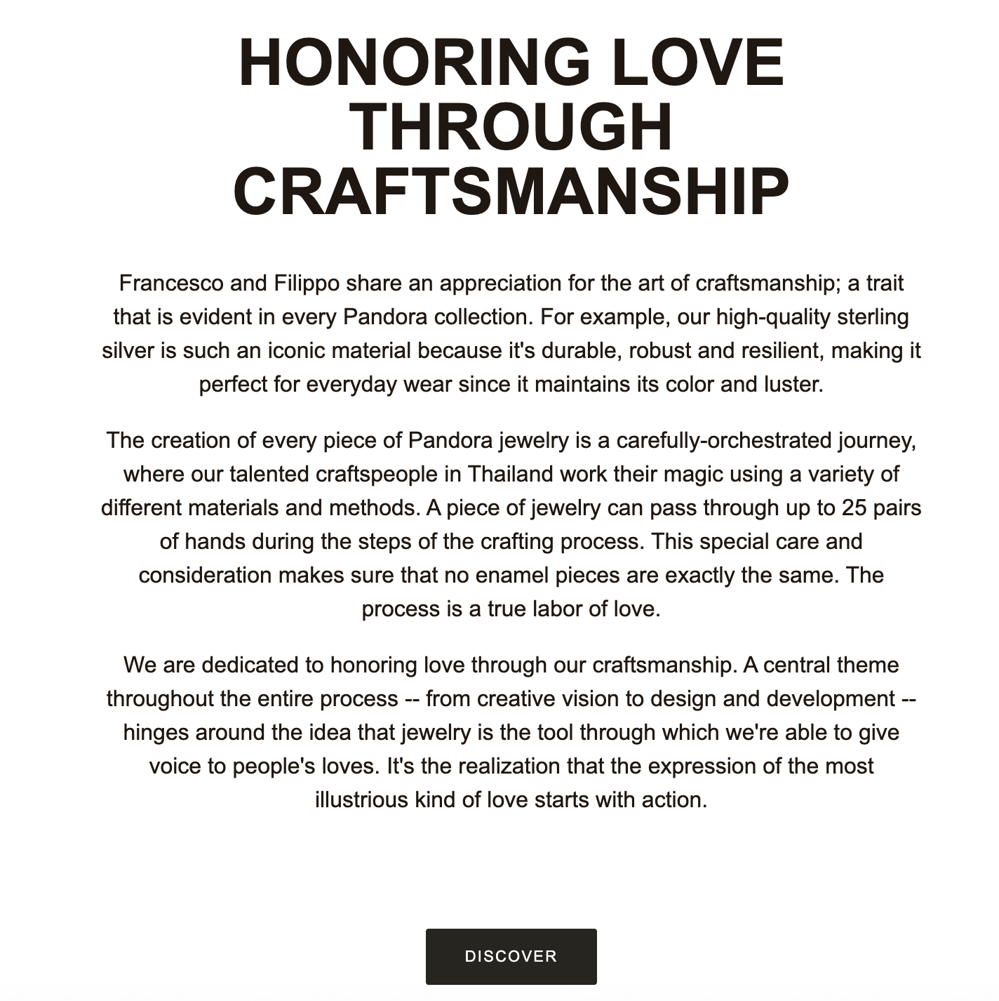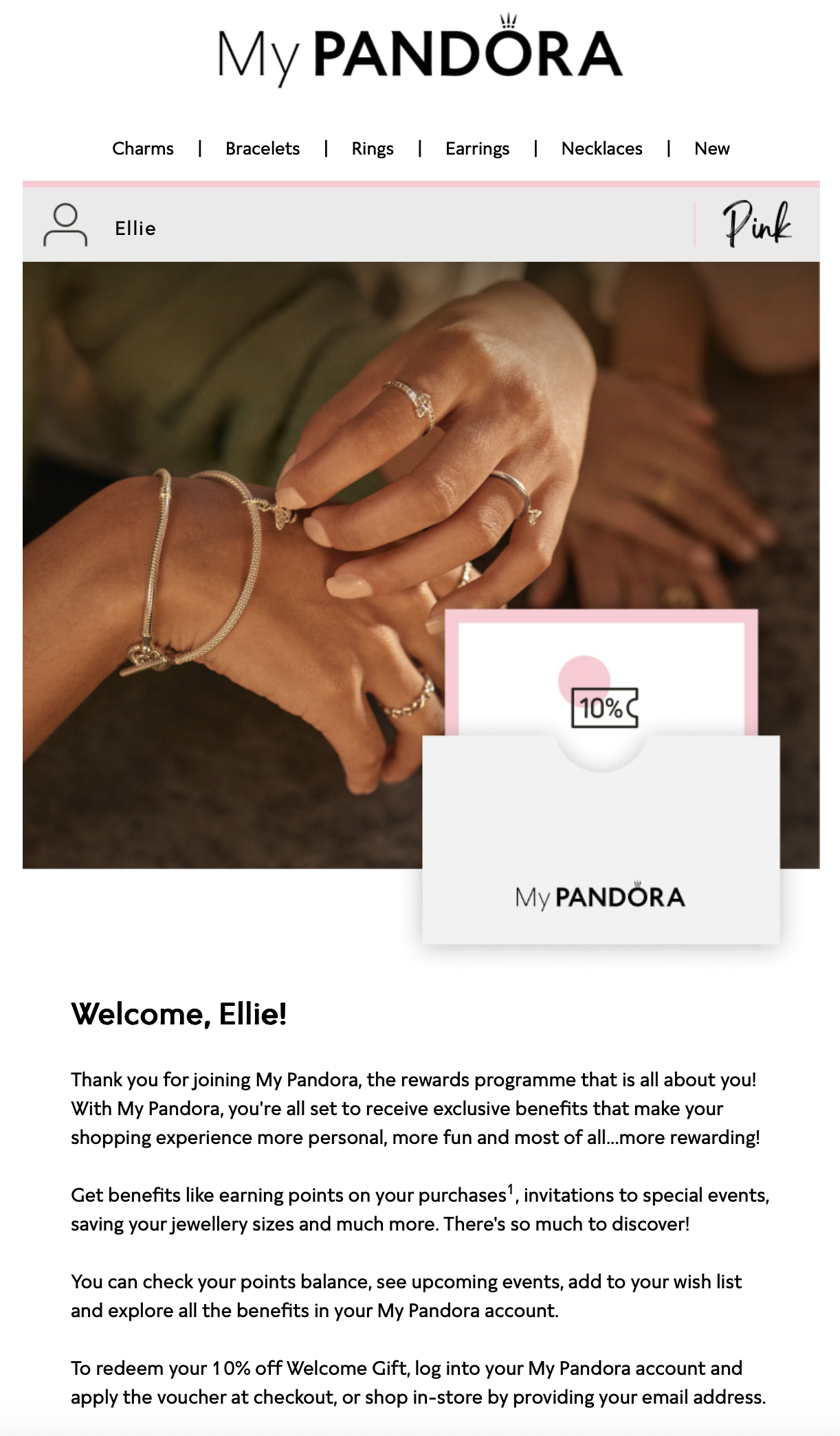 Since 2021, I’ve worked closely with the internal creative studio at Pandora, the global jewellery brand known for their iconic charm bracelets just as much as their loyal fan base. Over the years, I’ve helped shape how Pandora’s tone of voice is expressed across touchpoints, ensuring consistency and character across everything from CRM flows to TikTok posts. I’ve also contributed to the ongoing evolution of the brand’s verbal identity, writing guidelines for key jewellery categories. The result: copy that balances emotional connection with commercial performance, in a tone that sparkles as brightly as their fine jewellery.